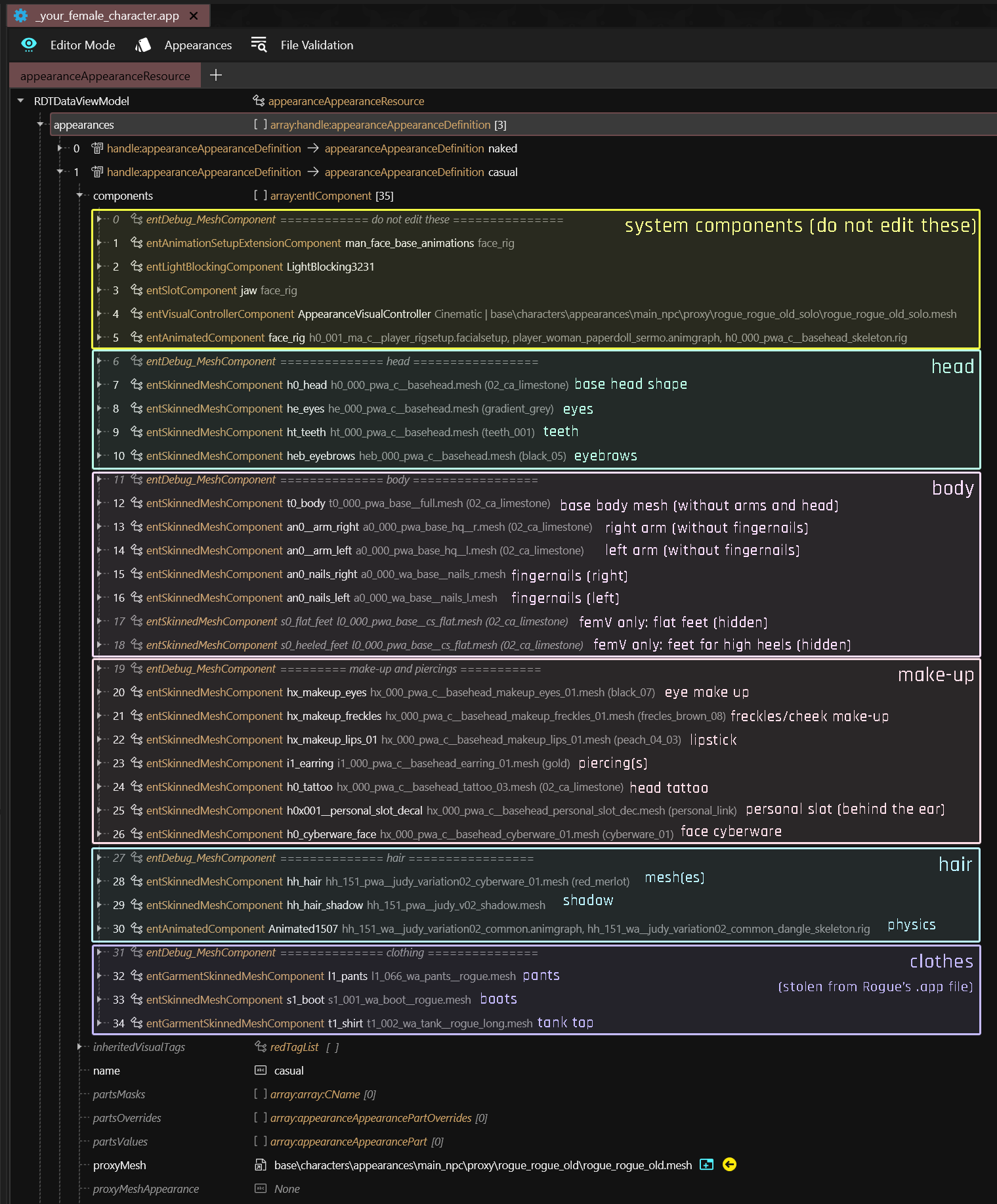 [Do you want to know more?](https://github.com/CDPR-Modding-Documentation/Cyberpunk-Modding-Docs/blob/main/for-mod-creators-theory/files-and-what-they-do/appearance-.app-files) (You don't need any of this information to finish the guide.)