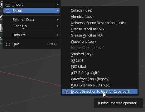 With the body object selected, go to File > Export > Export Selection to GLB for Cyberpunk:
