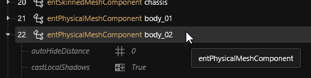 You also need to duplicate the entPhysicalMeshComponent of the part you are copying. Rename it with the “name” value to the one you used earlier, (body_02). Set the “mesh” value to the same mesh path.