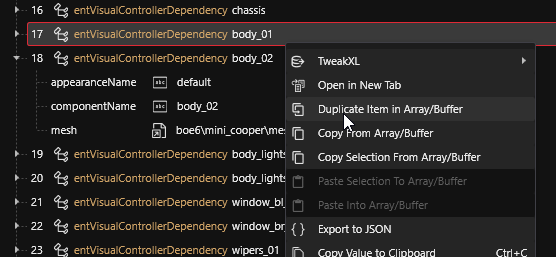 To add a new component instead of replacing a default one, you can duplicate the entVisualControllerDependency of the most similar component by right-clicking and selecting “Duplicate Item in Array/Buffer”.