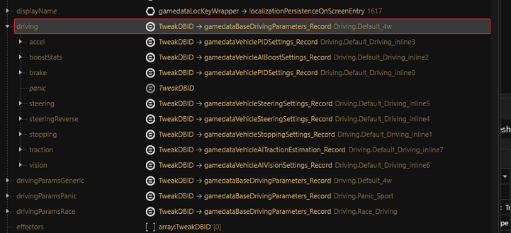 Check Tweaks: `gamedataBaseDrivingParameters_Record` under `driving`