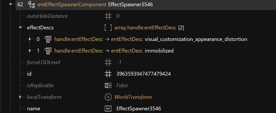 We also need an entEffectSpawnerComponent for Crystal Coat fx effects. You can copy paste this as-is from the Aerondight .ent (base\vehicles\sport\v_sport1_rayfield_aerondight__basic_01.ent): EffectSpawner3546