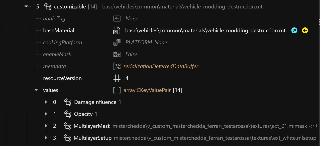 customizablematerial entry, and copy-paste the material definition from for eg.base\vehicles\sport\v_sport1_rayfield_aerondight\entities\meshes\v_sport1_rayfield_aerondight__ext01_hood_a_01.mesh