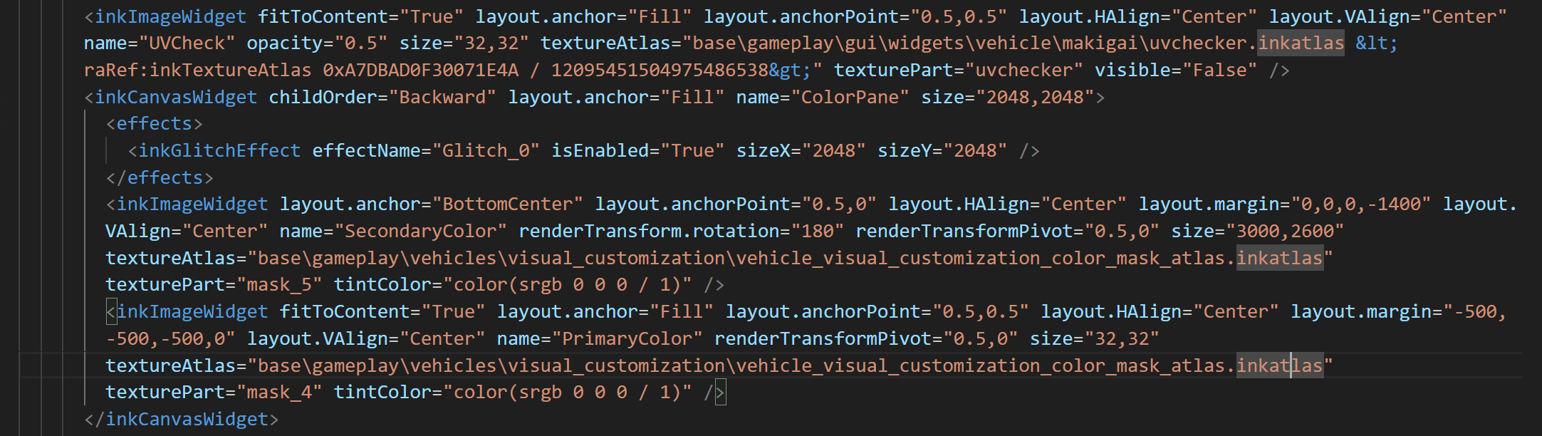 Here we see two InkImageWidgets being defined for the two colors that can be set for Crystal Coat. We also see a textureAtlas -> this is the mask which defines how the color is painted and controlled further with the layout and renderTransform values.