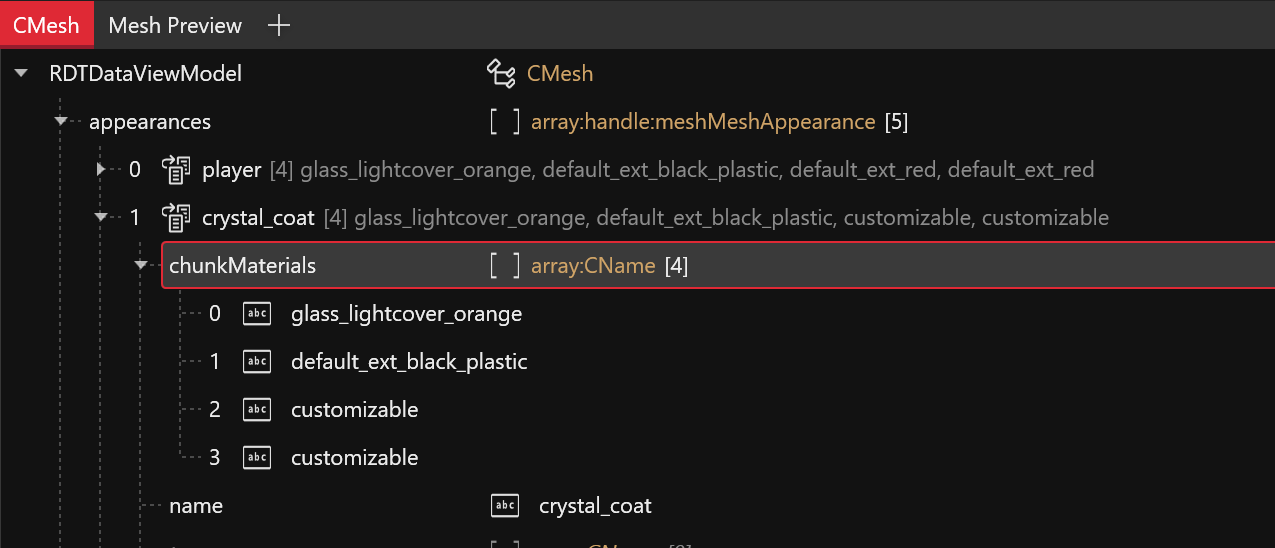 For all the meshes that will change color, we need to add a new mesh appearance that uses the .mt I mentioned earlier