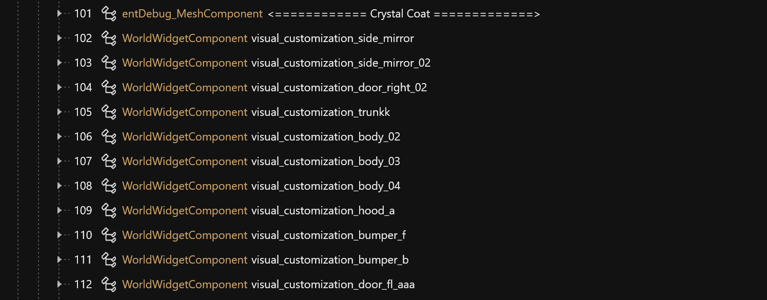 To do this let's look at the Crystal Coat inkwidget (WorldWidgetComponent > widgetResource > base\gameplay\vehicles\visual_customization\vvc_car_appearance_widget.inkwidget)