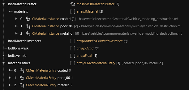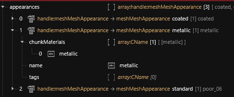 For all painted components duplicate the `metallic` appearance and replace its name and chunk with `glossy`. Then duplicate the `materialEntries` `metallic` entry and name it `glossy` then duplicate the associated `localMaterialBuffer > materials` `metallic` entry.