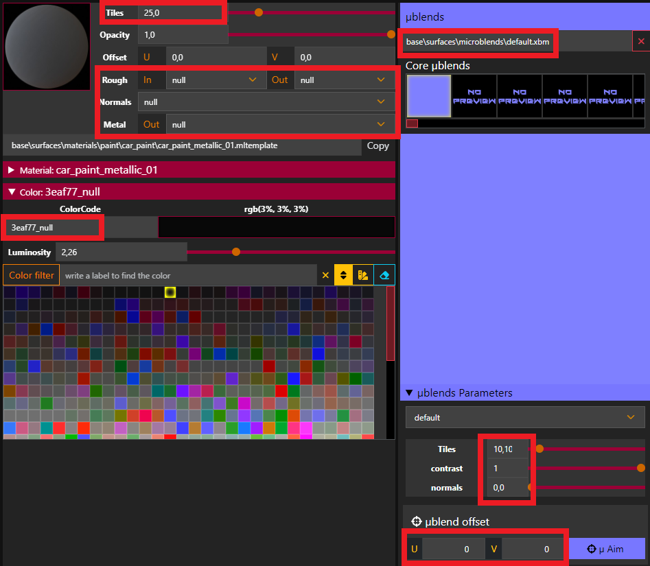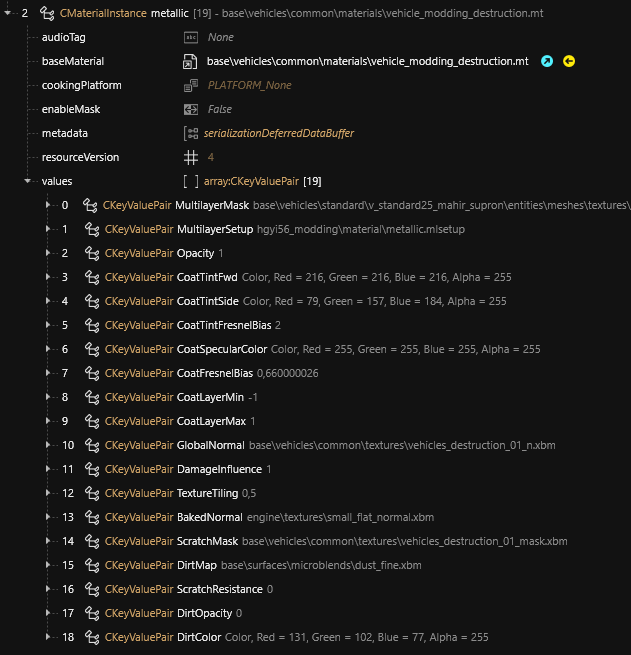 This is the default metallic car paint material of the game. Then set these values into the material settings. Apply edits on the left before doing anything else or your changes will be lost.
