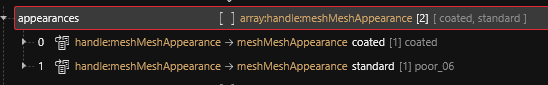 Next, we know that the original material for this mesh is named `poor_06` so remove all entries from `localMaterialBuffer > materials` and `materialEntries` arrays except this one. Then duplicate it in both arrays and name the new ones `coated`.