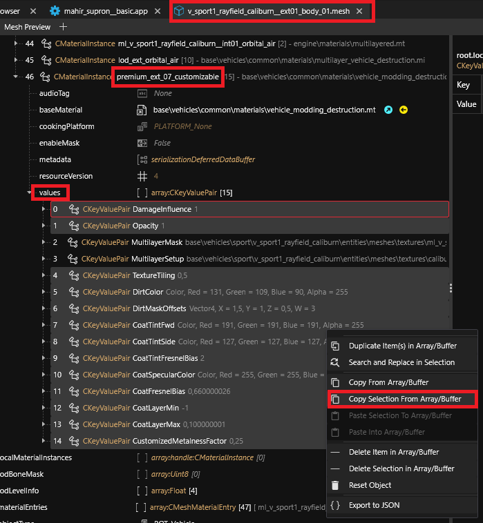 Then right-click on the `values` array of your vehicle's body `coated` material and choose `Paste Selection To Array/Buffer`.