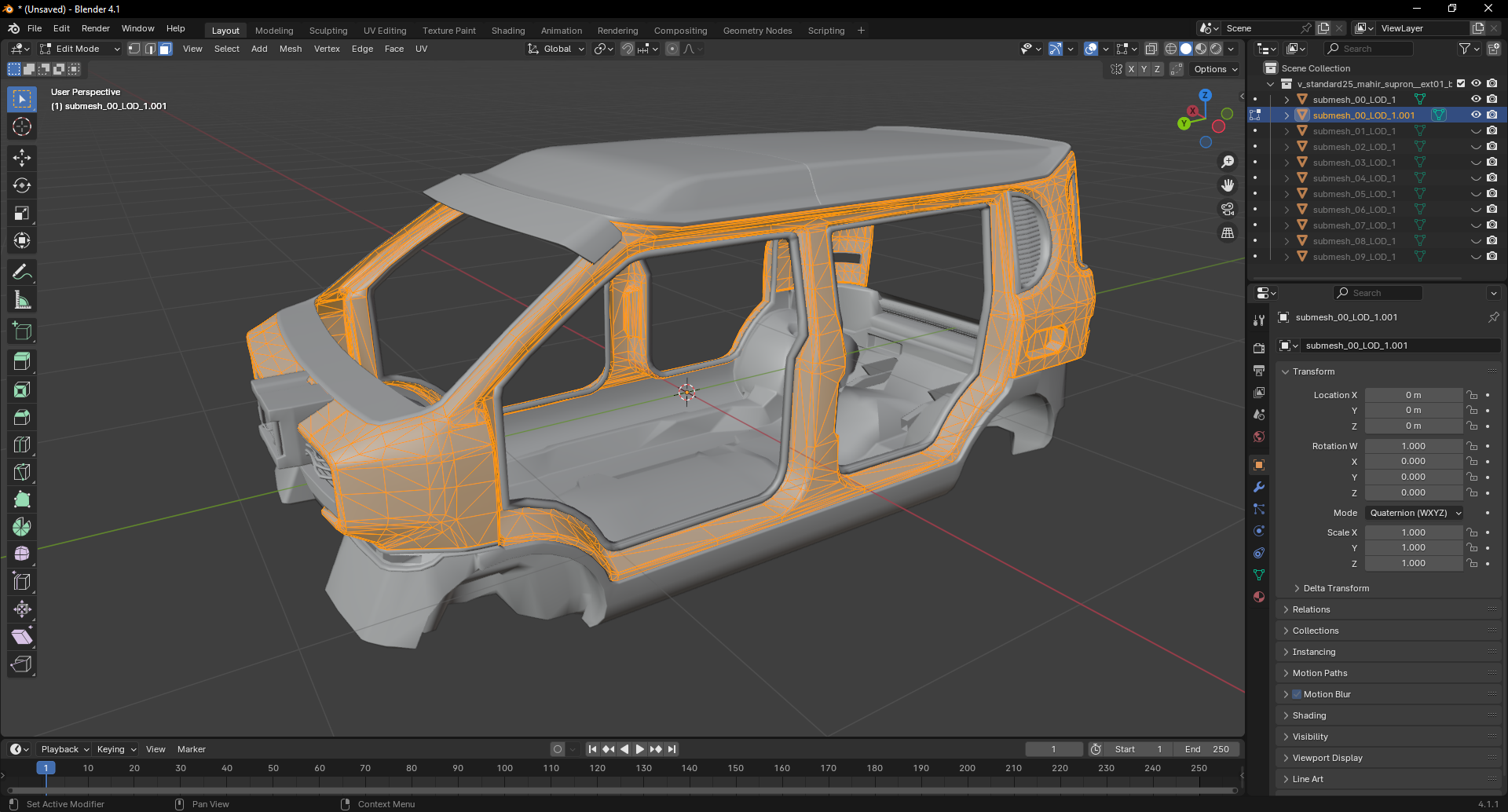 I will use the example of the `body_01` component which is the biggest one of the vehicle. The idea is always the same: submesh the component into multiple ones so you can customize as many sub-parts of the component as you wish and treat them automatically with a script.