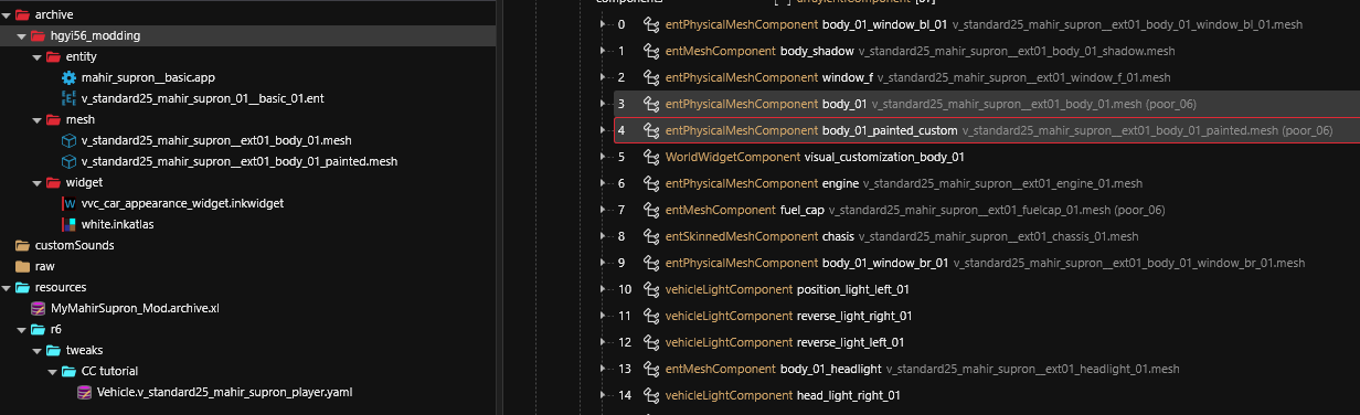 Import both files back into WolvenKit. Now we need to configure the new mesh component to allow it to be colored.