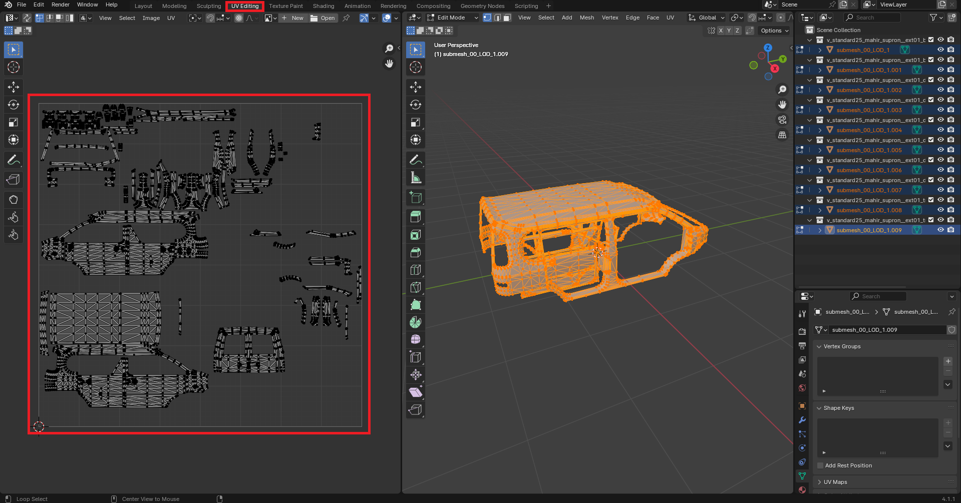 In the case your vehicle uses a different UV layout for each component it becomes more difficult to define shapes that will apply across multiple parts.