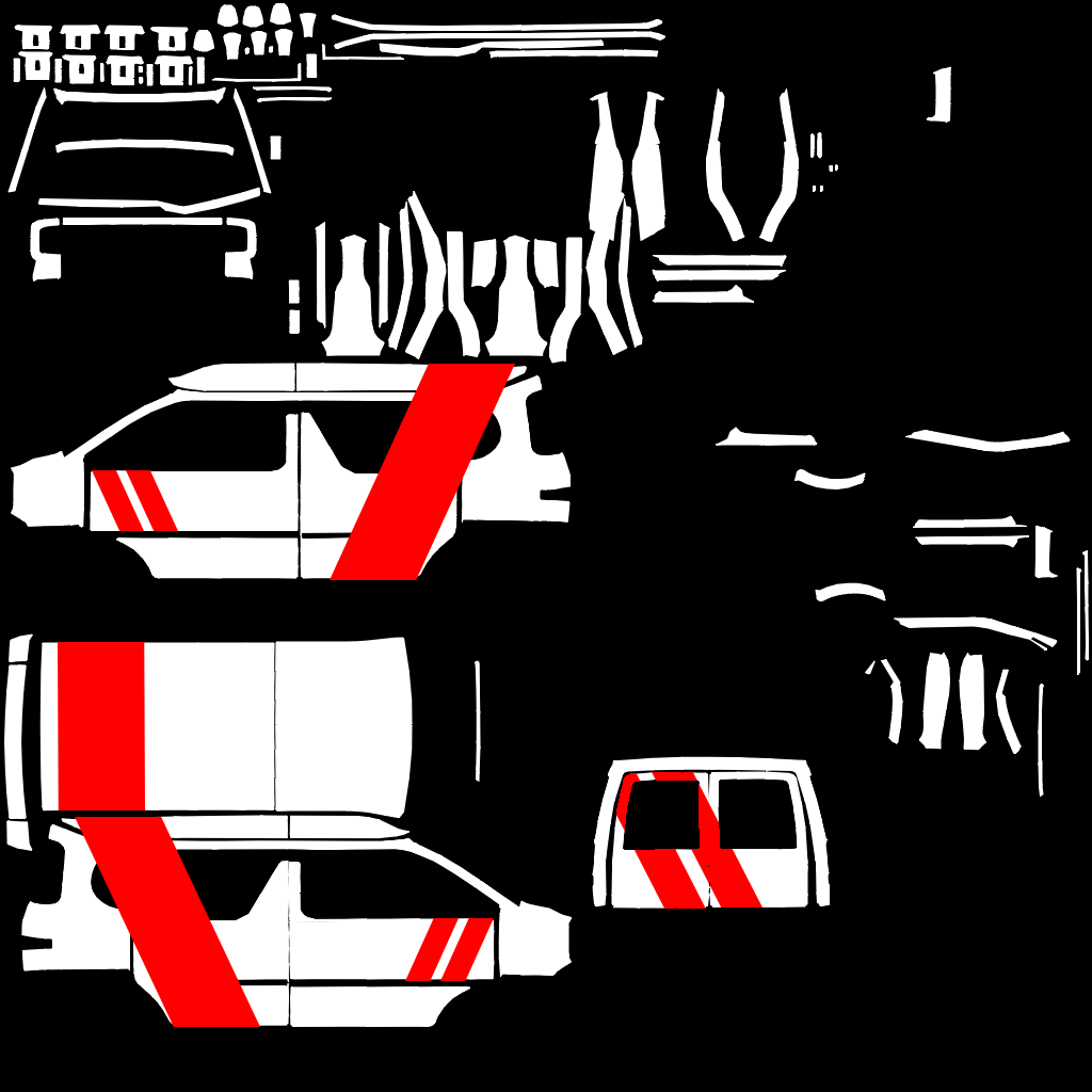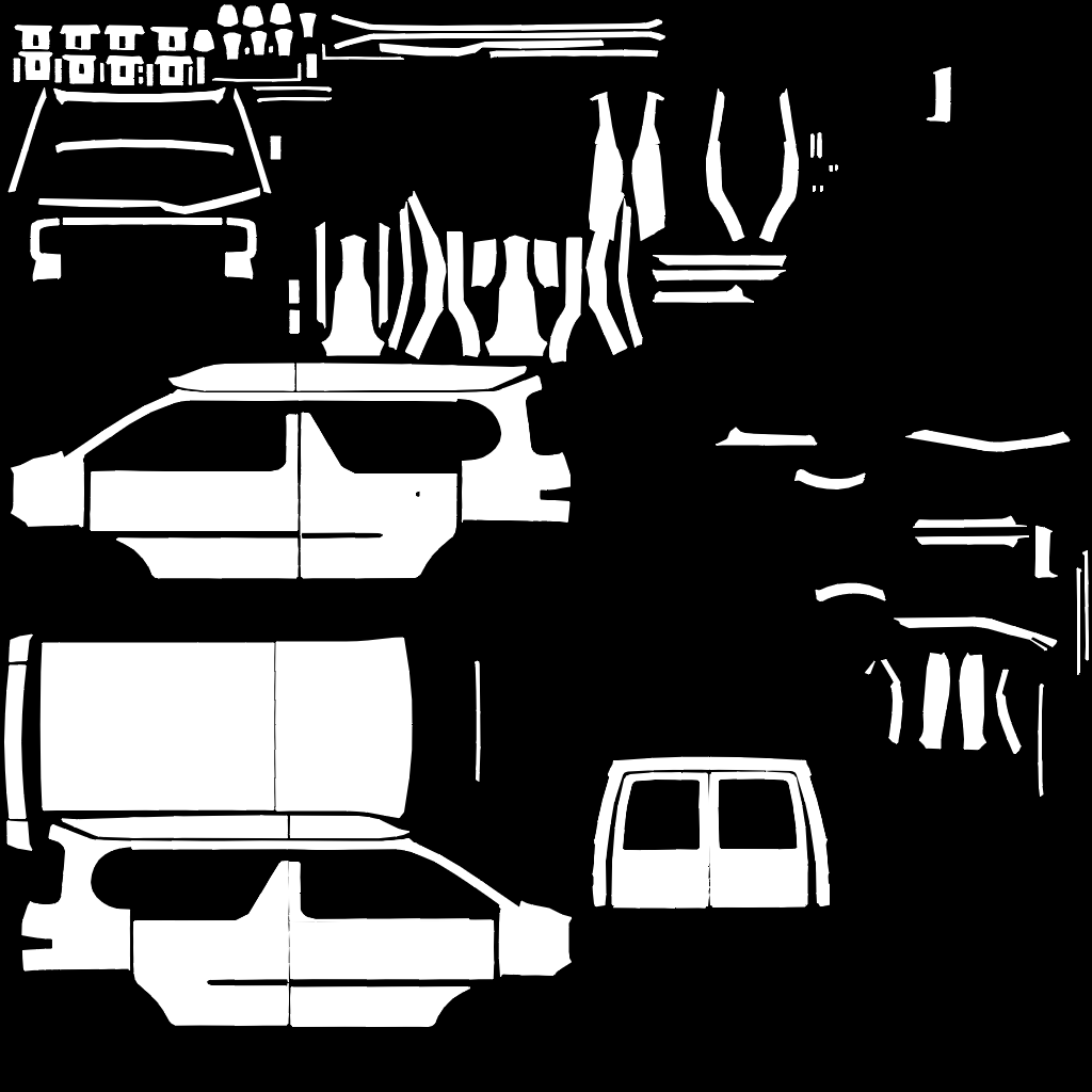 In order to create a clean UV layout for your secondary color pattern, you should create your own mask using the mesh files. Export all the mesh files involved in the vehicle paint using the menu `Tools > Export Tool`.