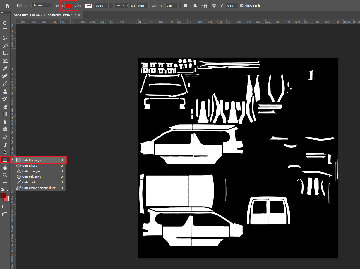 The next part is to define your secondary color pattern by adding shapes on top of your mask using dynamic objects (like the Rectangle tool) or any other technic as long as they belong to a dedicated layer. I recommend that you use red shapes so you can see them better.