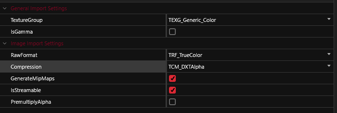 <figure><img src="https://1427525421-files.gitbook.io/~/files/v0/b/gitbook-x-prod.appspot.com/o/spaces%2F4gzcGtLrr90pVjAWVdTc%2Fuploads%2Fgit-blob-fbebe94aa9aba6ee2acc605816d093ea50f73405%2Fimage.png?alt=media" alt=""><figcaption><p>Texture import settings</p></figcaption></figure>
