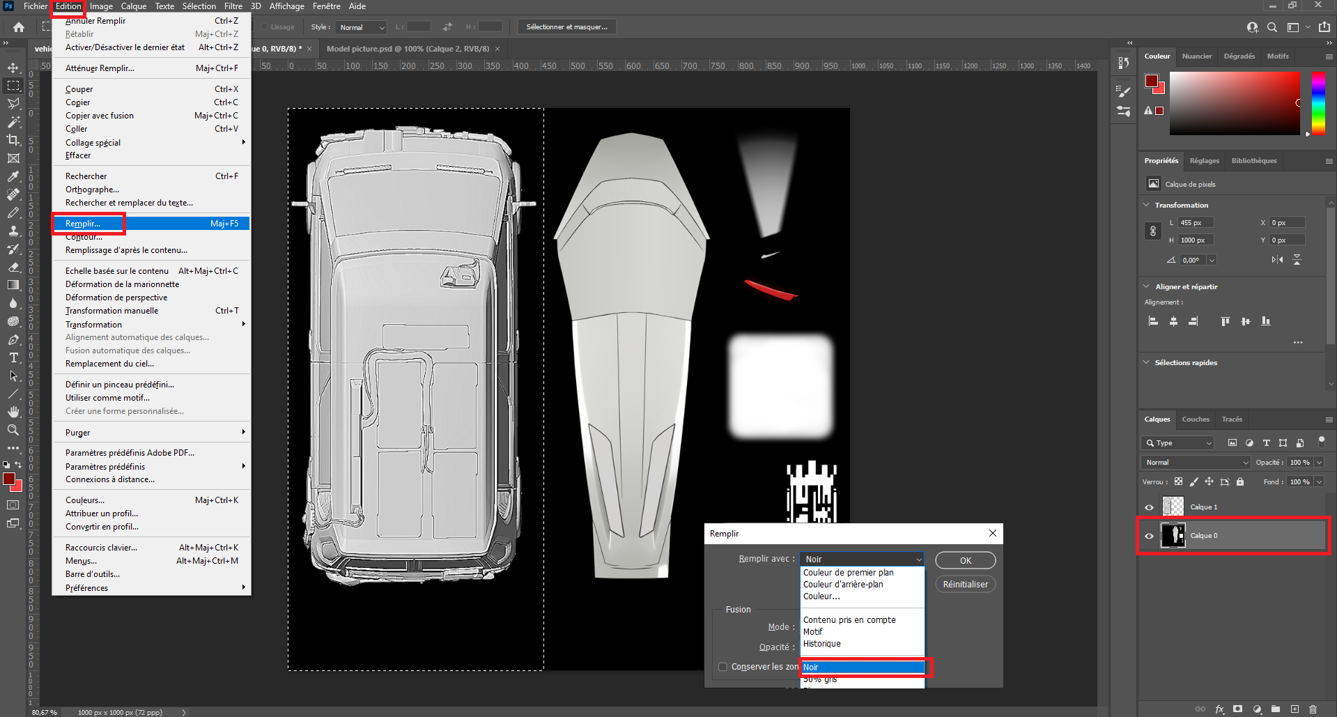All you have to do is to fill the secondary color mask area with black color on both channels. The next step is to modify the headlight element.