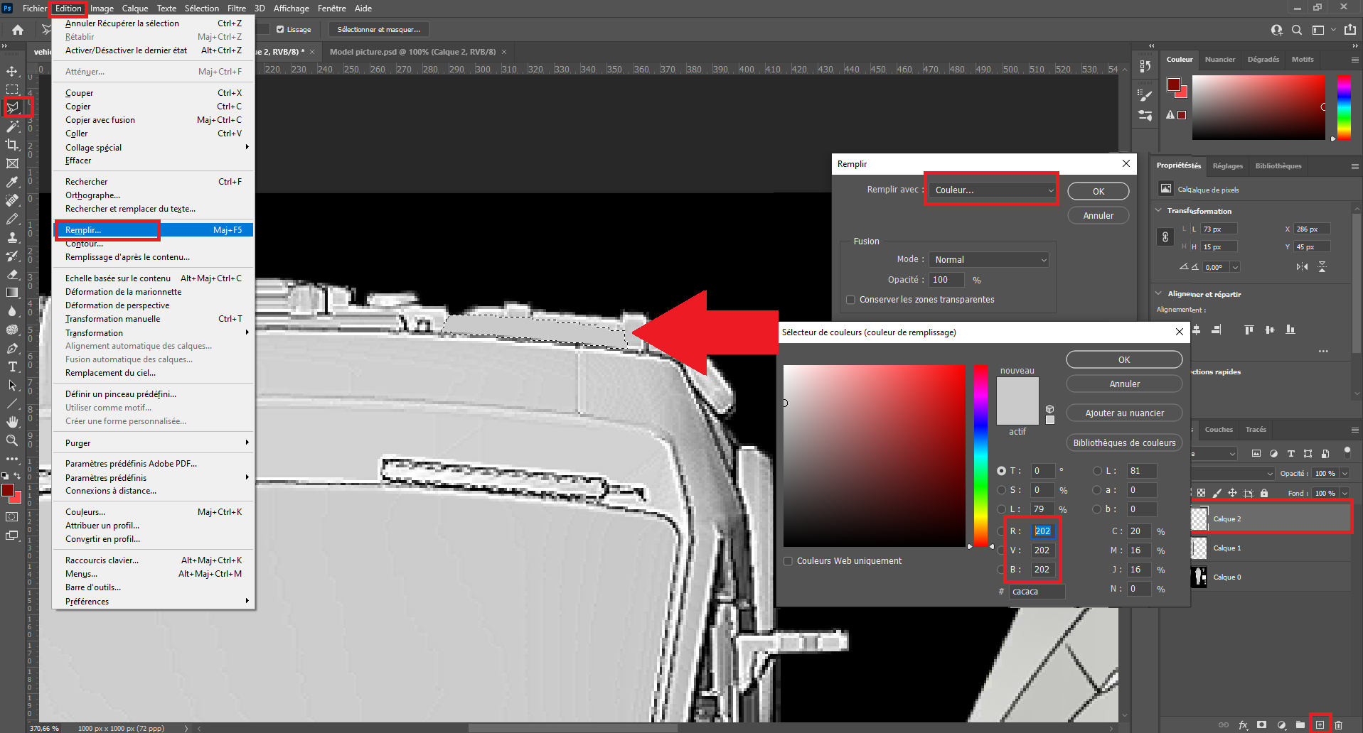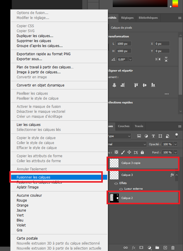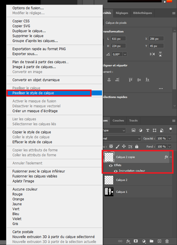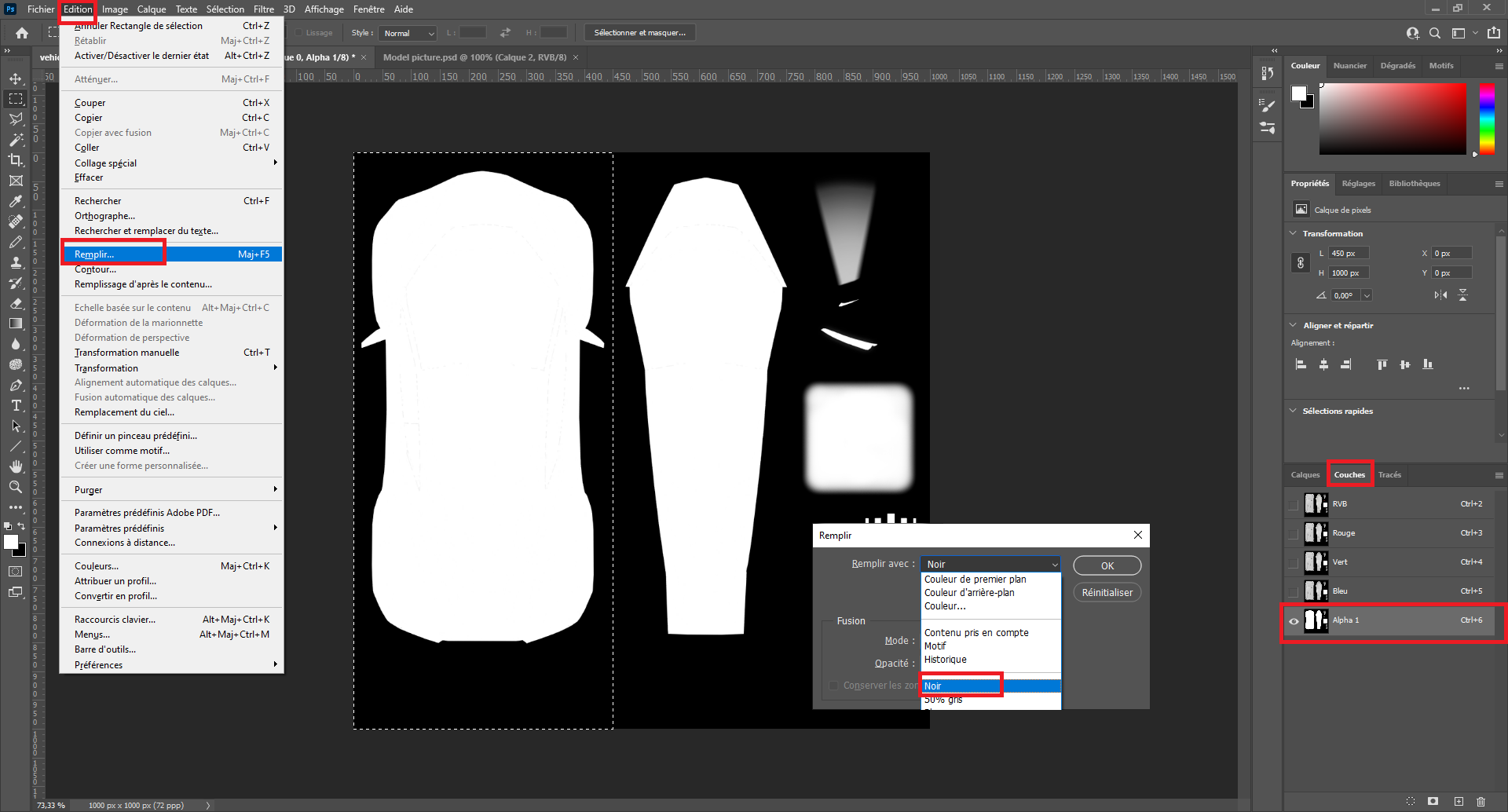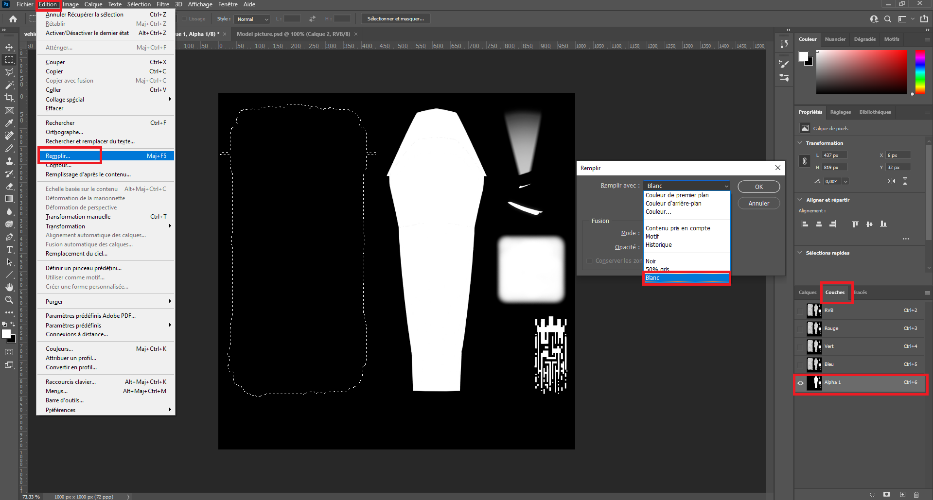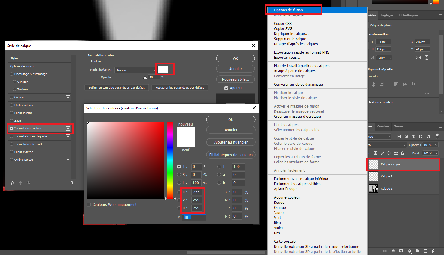 Concerning the Alpha channel we will do differently. Once the element is placed correctly, duplicate the layer using CTRL + J in the RGB channel and create a style on it to make it full white. To do so right-click on the new layer and select the first element of the list. Then add a color coating with white color.