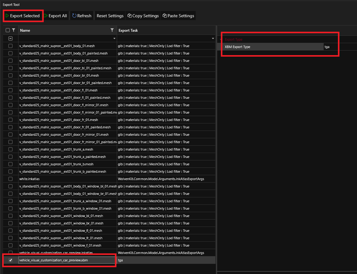 Now save the picture as TARGA / TGA image and be sure to select 32-bits/pixel and import it back into WolvenKit using the `Tools > Import Tool`.