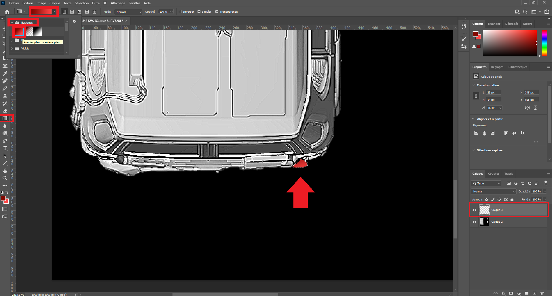 Now we are going to repeat the same process for the tail light element. Except that instead of filling it with gray color, we are going to use the gradient tool with a dark red and a light red color.