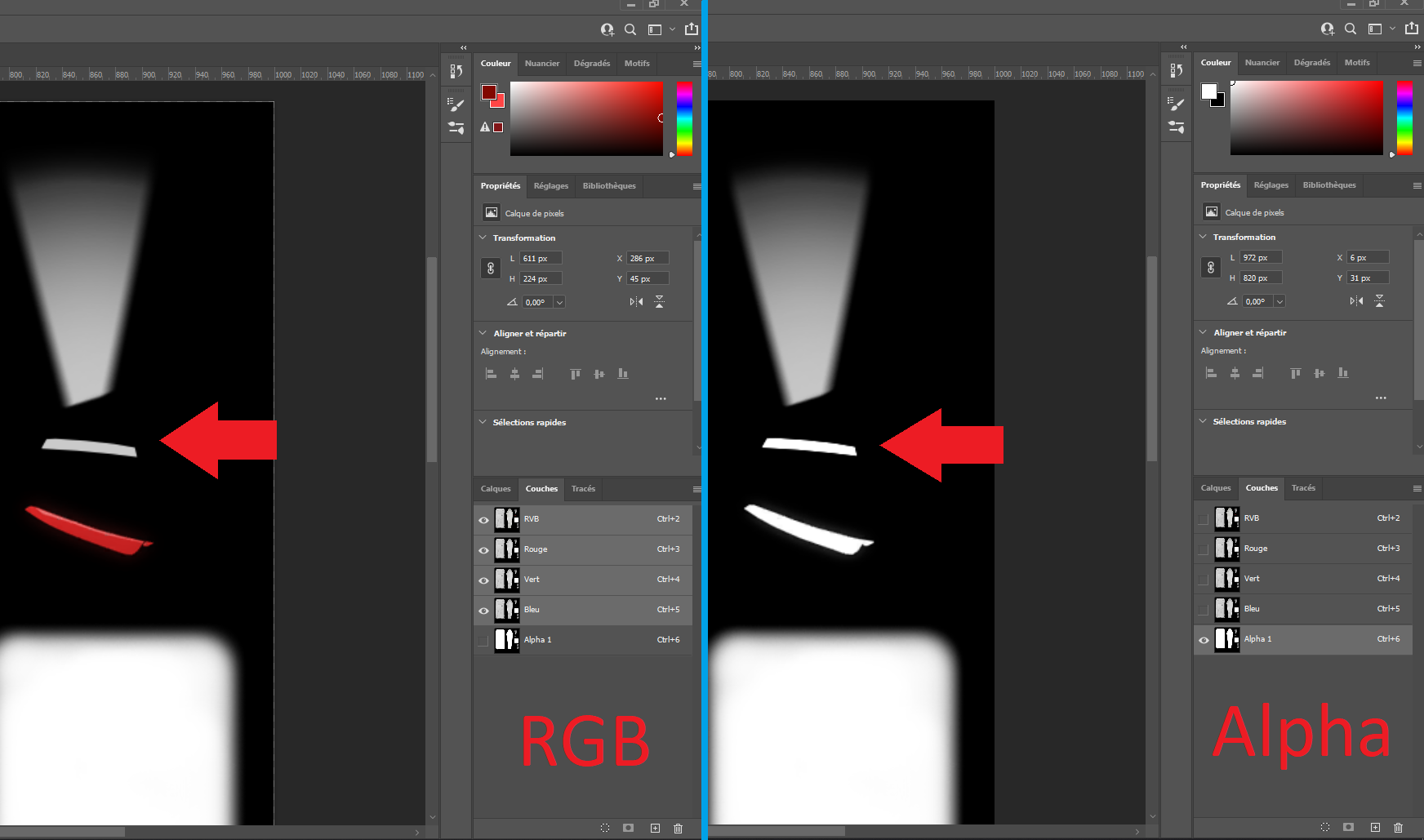 Finally switch back and forth from RGB channel to Alpha channel to check that both elements are at the same location. You should see a white element in the Alpha channel while it is a little bit darker one in the RGB channel.