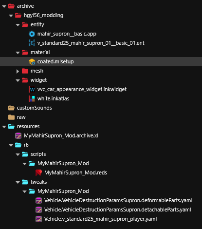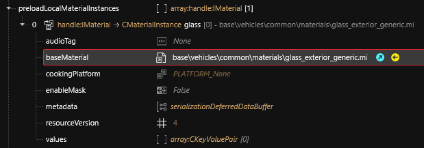 mlsetup = base\vehicles\standard\v_standard25_mahir_supron\entities\meshes\textures\supron_poor_06.mlsetupAdd the mlsetup file to your project and place it into your unique folder. Then rename it with a simple name like coated.mlsetup. Then assign it to all your *_painted_custom components in their respective coated material definition: localMaterialBuffer > materials > coated > MultilayeredSetup.