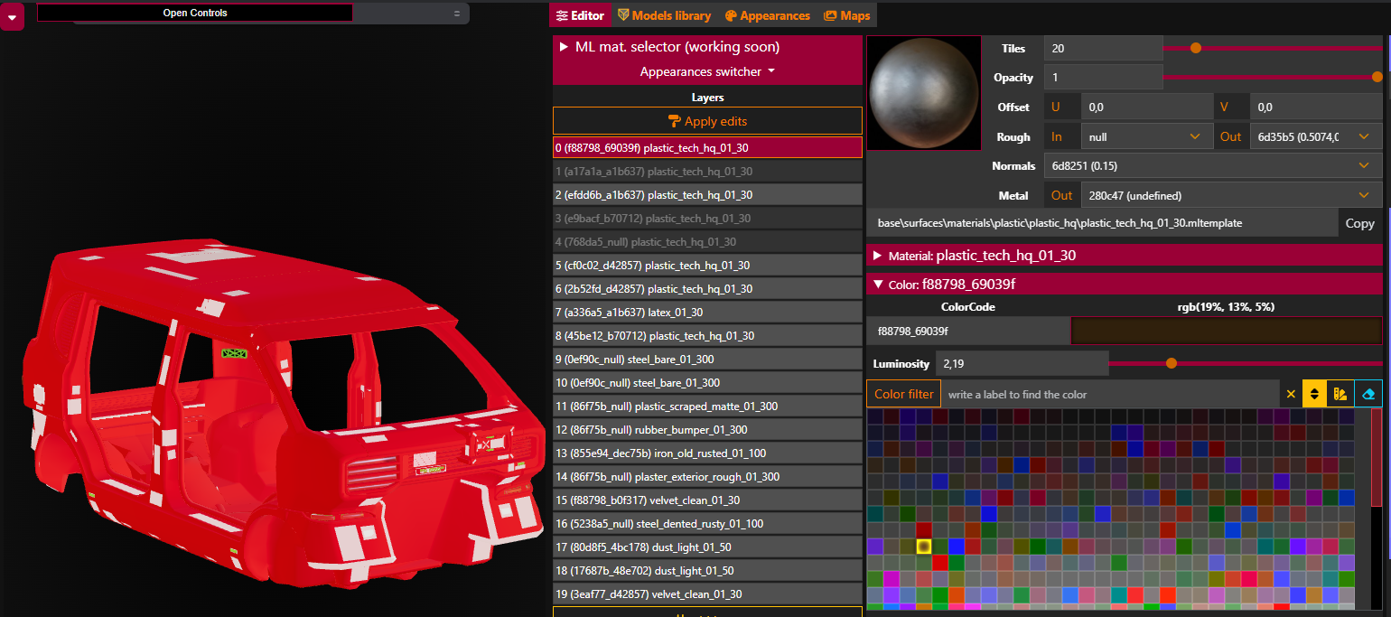 The different rust marks on the vehicle are part of some layers. In order to remove them we only need to change the opacity of the relevant layers to 0. Click on each layer to identify messy ones and modify their Opacity slider to 0 then click on Apply edits before working with another layer.