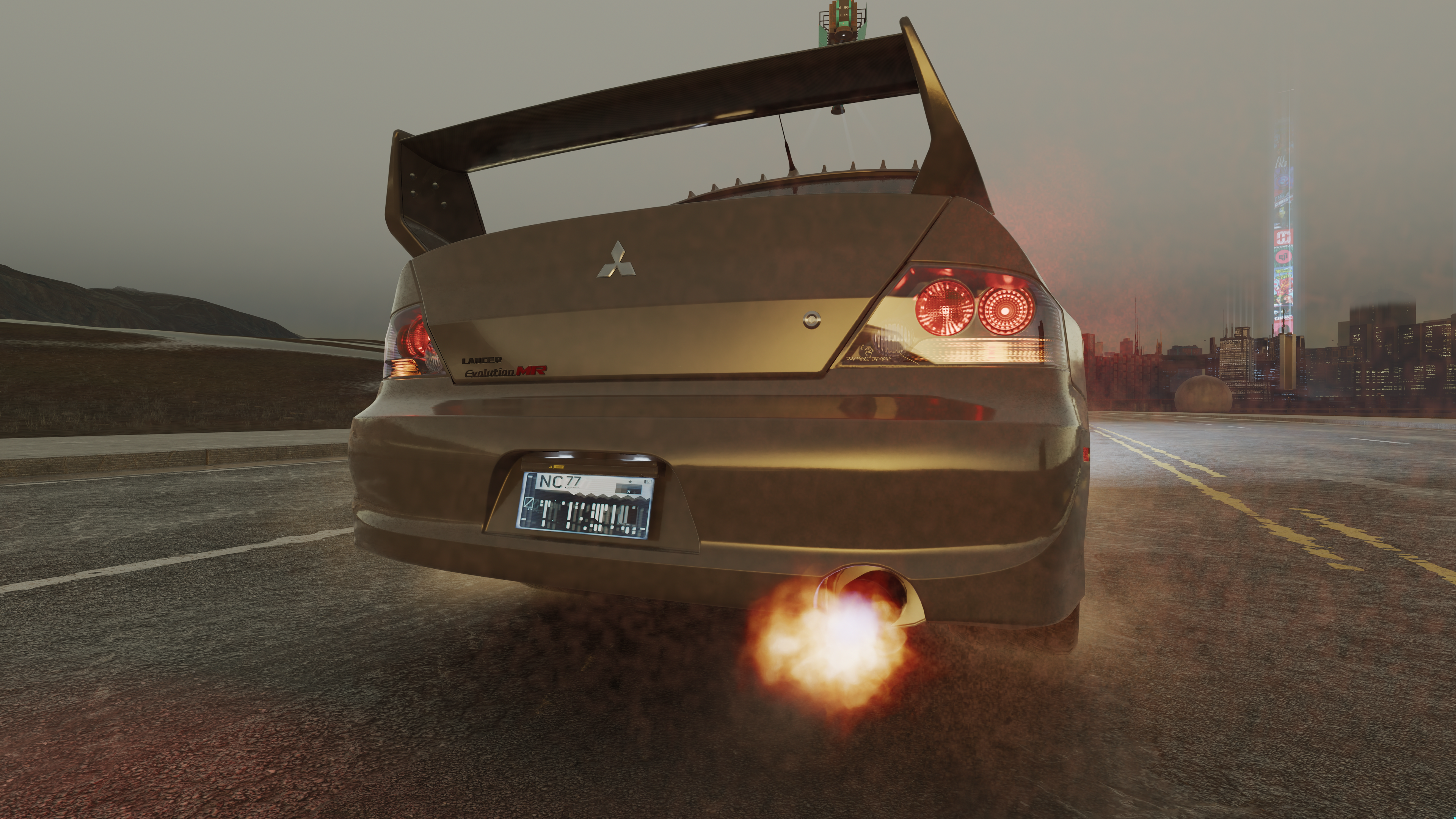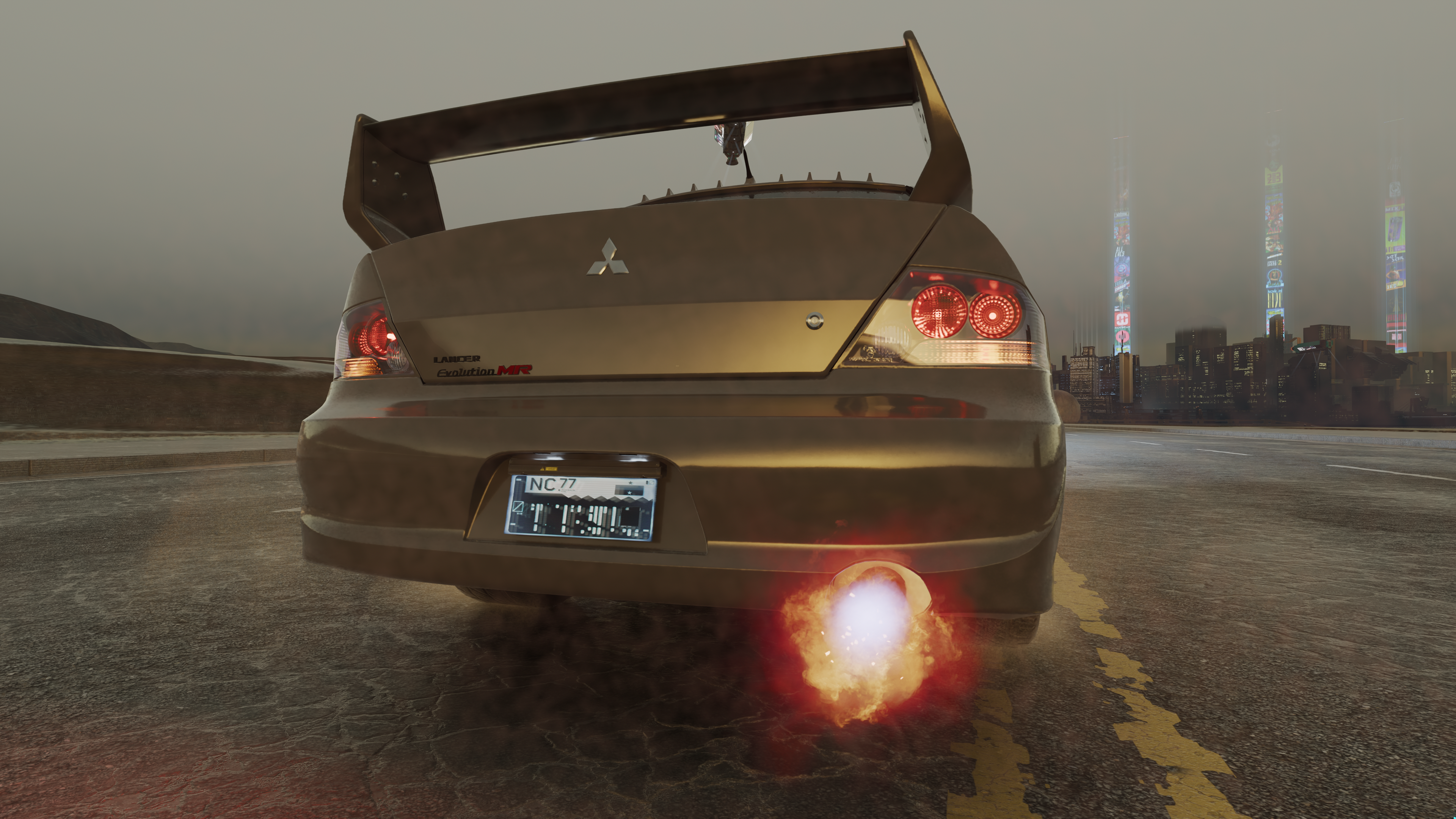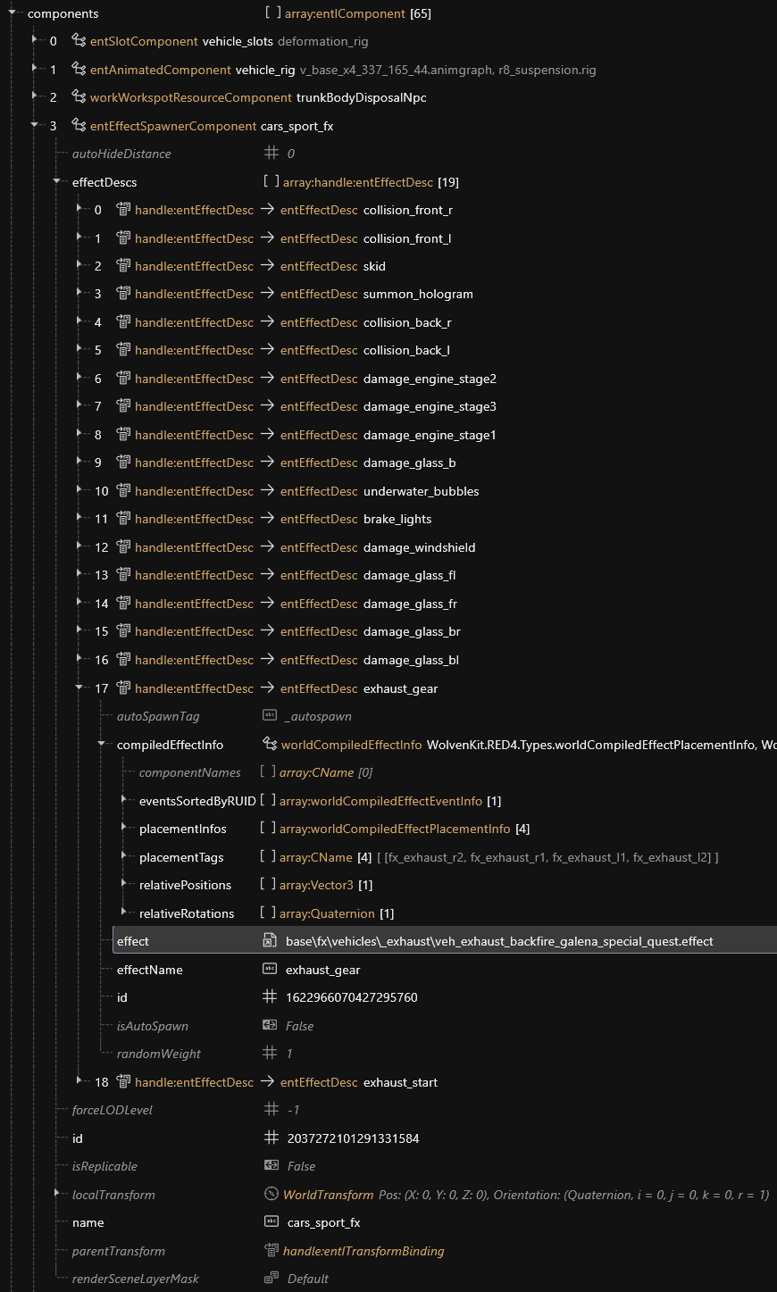 The game features different exhaust backfire effects. This article documents the look of each for easy reference. To change the backfire effect, open the root `.ent` of your vehicle and navigate to `components > "cars_sport_fx" > effectDescs > "exhaust_gear" > compiledEffectInfo > effect`. Note that the names in quotes might be different for each car. The one named `cars_sport_fx` is always an `entEffectSpawnerComponent`, so that might give you an idea on where to start. The `.effect` files used there can be found under `base\fx\vehicles\_exhaust\`.
