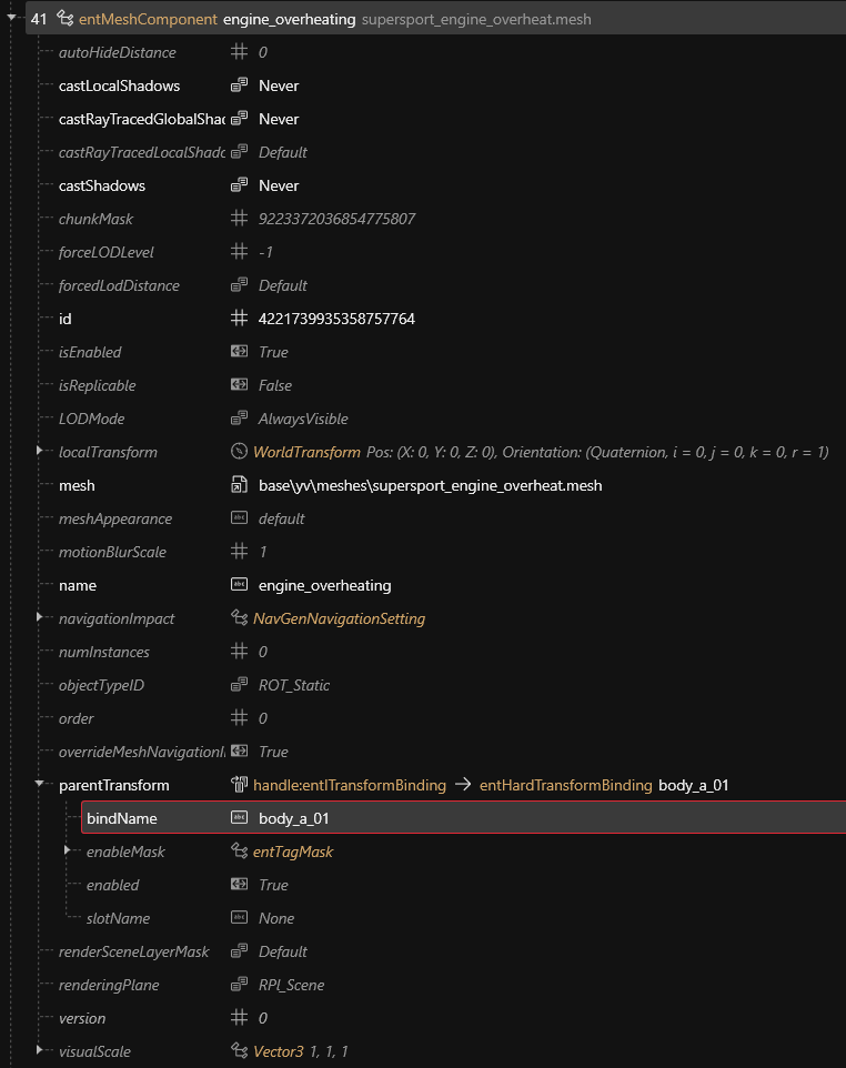 * In this case, we'll be adding the overheating effect to the exhaust pipe which is attached to the body of a motorbike. As such, the `bindName` of the `parentTransform` of the `component` needs to be set to `body_a_01` as that is the name of the `component` of the body.