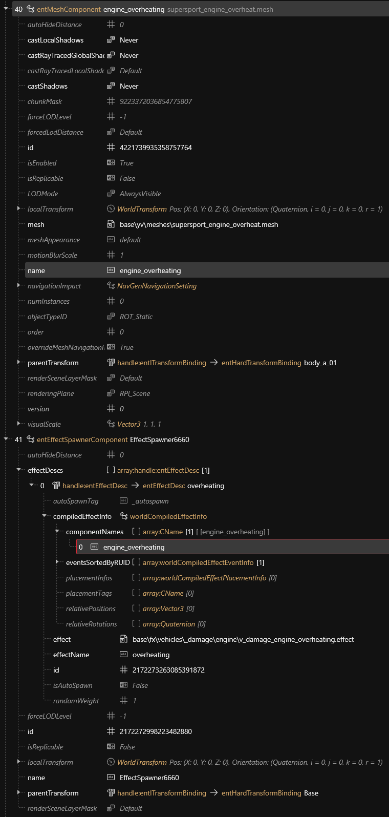 * Navigate all the way down to `entEffectDesc overheating > compiledEffectInfo > componentNames`