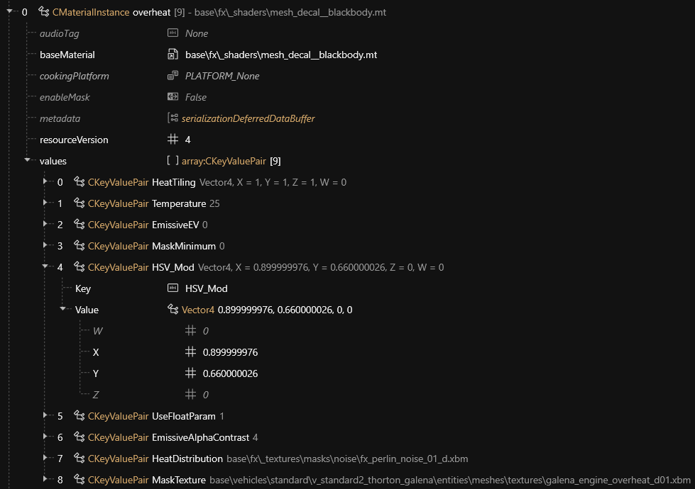 * Open the `.mesh` and navigate to `preloadLocalMaterialInstances > overheat > values` again.