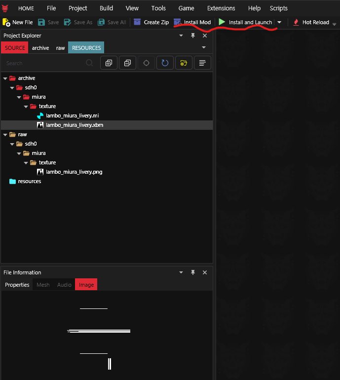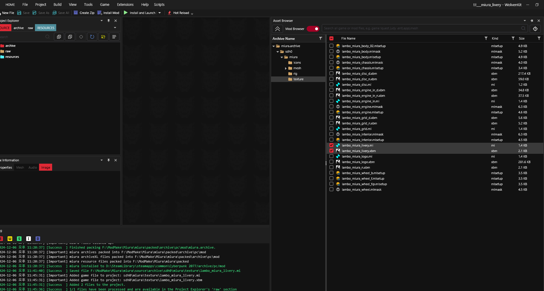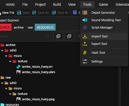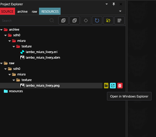 The resulting texture will show up in your project's [`raw` folder](https://app.gitbook.com/s/-MP_ozZVx2gRZUPXkd4r/wolvenkit-app/editor/project-explorer#raw) (use the `source` tab to see all project files)
