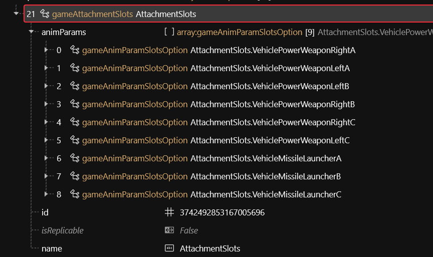 2. In the reference file, scroll to the bottom of the list and find the `entSlot` entries corresponding to the car's weapons.