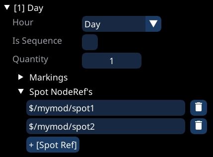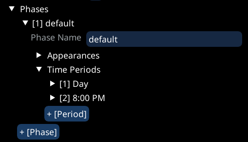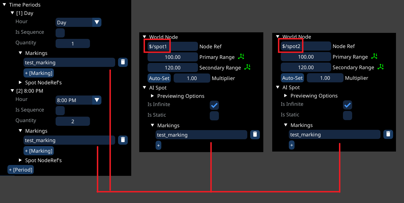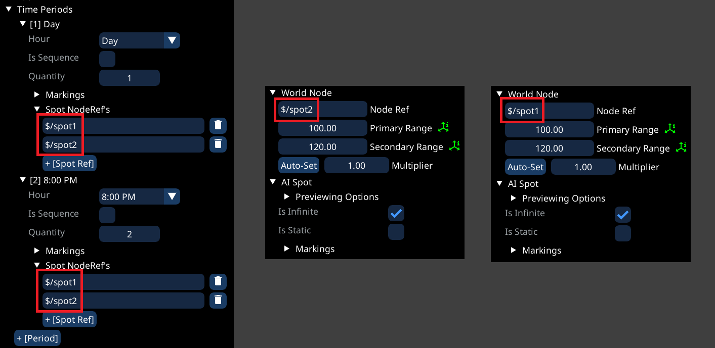 <figure><img src="https://1427525421-files.gitbook.io/~/files/v0/b/gitbook-x-prod.appspot.com/o/spaces%2F4gzcGtLrr90pVjAWVdTc%2Fuploads%2Fgit-blob-d2769d2307d0605497506e0fd43d41e4a39ba77f%2FtimePeriodspotRefsExample?alt=media" alt="" width="322"><figcaption><p>Example of making the NPC of the "Day" period use one of the two defined AISpots</p></figcaption></figure>
