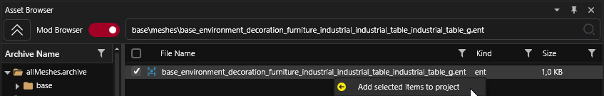 * Open the [*Asset Browser*](https://app.gitbook.com/s/-MP_ozZVx2gRZUPXkd4r/wolvenkit-app/editor/asset-browser), turn on the [*Mod Browser*](https://app.gitbook.com/s/-MP_ozZVx2gRZUPXkd4r/wolvenkit-app/editor/asset-browser#mod-browser) option, paste the path and add the ent to your project.