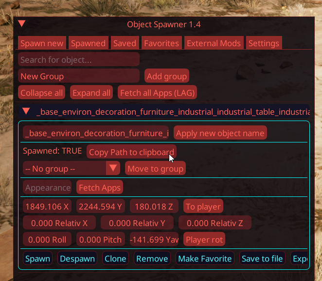 * In the `Spawned` menu, click on `Copy Path to clipboard` to get the current `.ent` path.