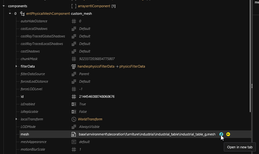 * If the selected entity is from **allmeshes** (starts with `base\meshes\` ), then there is probably only 1 <mark style="color:orange;">entPhysicalMeshComponent</mark> called *custom\_mesh*