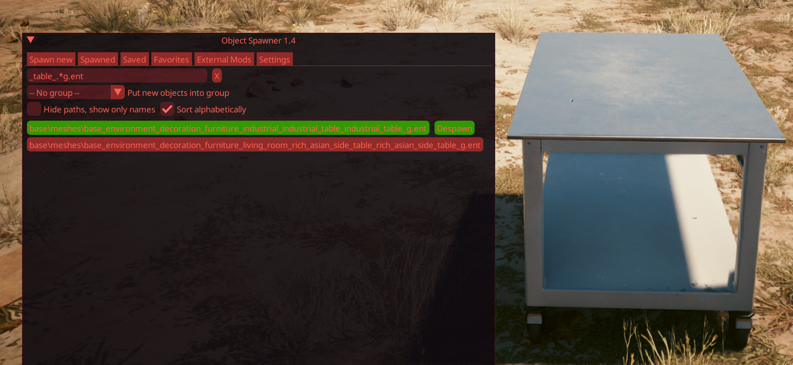 * Once in-game, search for the item you want to spawn; I'll be using `base\meshes\base_environment_decoration_furniture_industrial_industrial_table_industrial_table_g.ent`