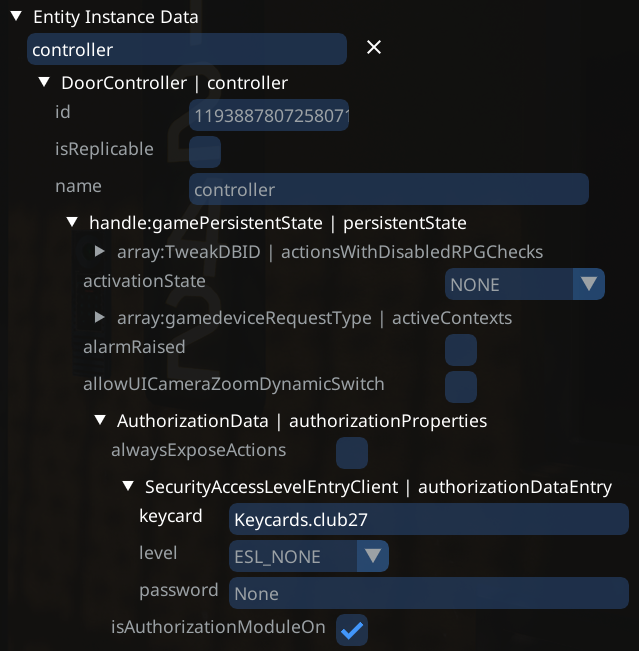 controller -> persistentState -> authorizationProperties -> authorizationDataEntry -> keycardCopy the keycard TweakDBID in the