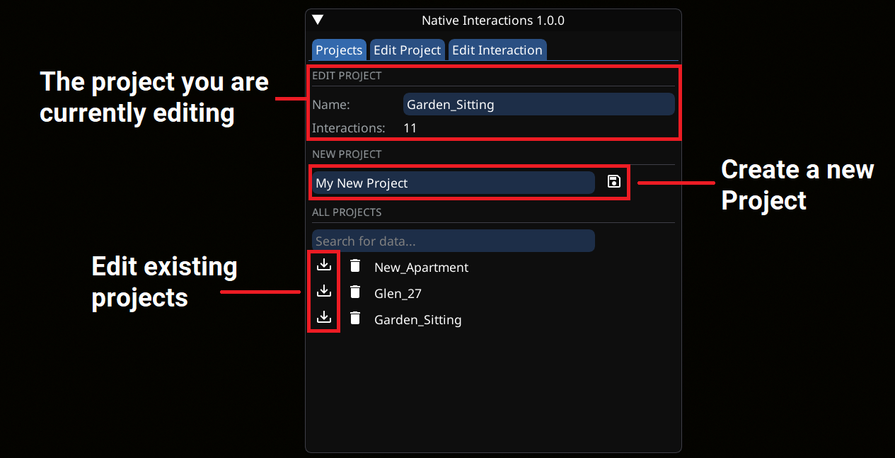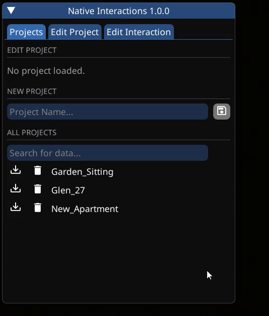 * To add an interaction, make sure you have loaded a project by pressing the "Load" icon to the left of it's name in the `Projects` tab