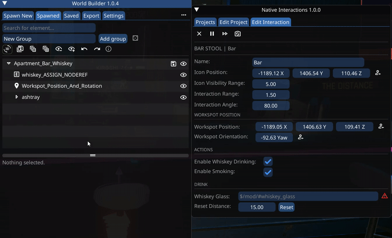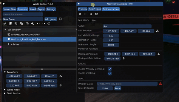 * Copy its position and rotation from under the `Transform` header over to the [Workspot Position controls](https://wiki.redmodding.org/cyberpunk-2077-modding/modding-guides/world-editing/interaction-settings#workspot-position) in the NIF window