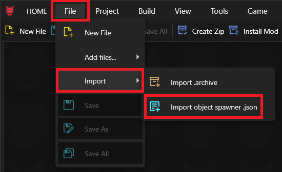 <figure><img src="https://1427525421-files.gitbook.io/~/files/v0/b/gitbook-x-prod.appspot.com/o/spaces%2F4gzcGtLrr90pVjAWVdTc%2Fuploads%2Fgit-blob-62ac9d32917e203ef350727c29e46c6146d3dc1e%2FobjectSpawnerWKitImportDialog?alt=media" alt="" width="413"><figcaption><p>Click the "Import object spawner .json" button, then choose the file</p></figcaption></figure>