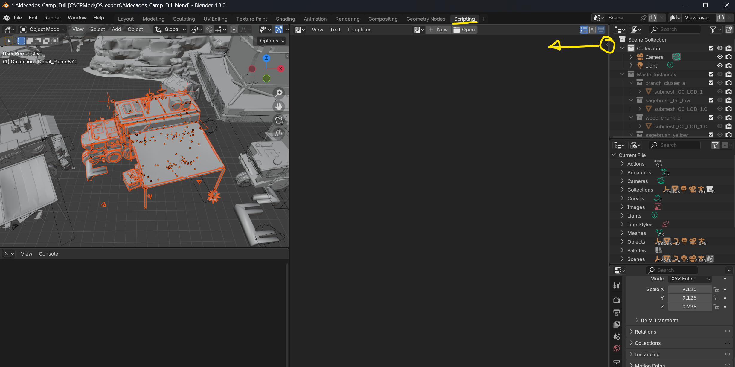 And unlike Mr Burns, we're not going to struggle. Select some stuff, switch to the scripting tab. In the empty text window, click the little arrow to the right to expand out the side panel.