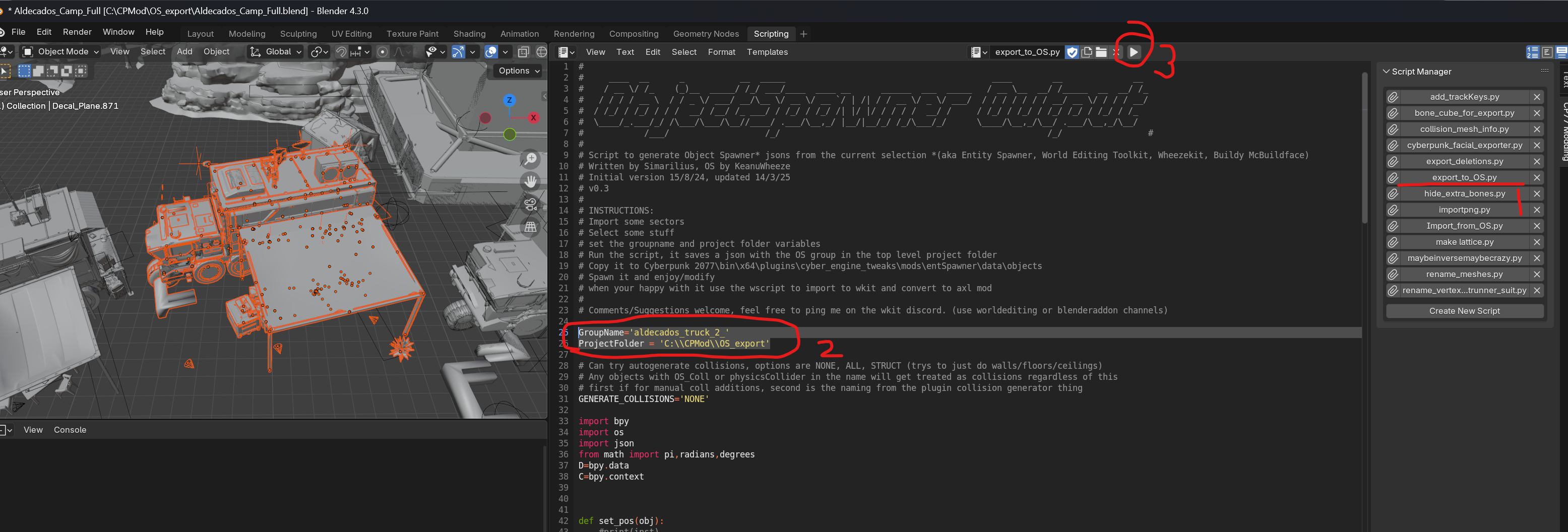 in the CP77 Modding tab theres a list of scripts, click the export\_to\_OS.py one (1 below). This will open in the text window. At the top of the script, theres a variable for the folder to save to, and the groupname (2). Set the folder, and define a group name. Currently it writes over that filename everytime you run it, so change it between selections.