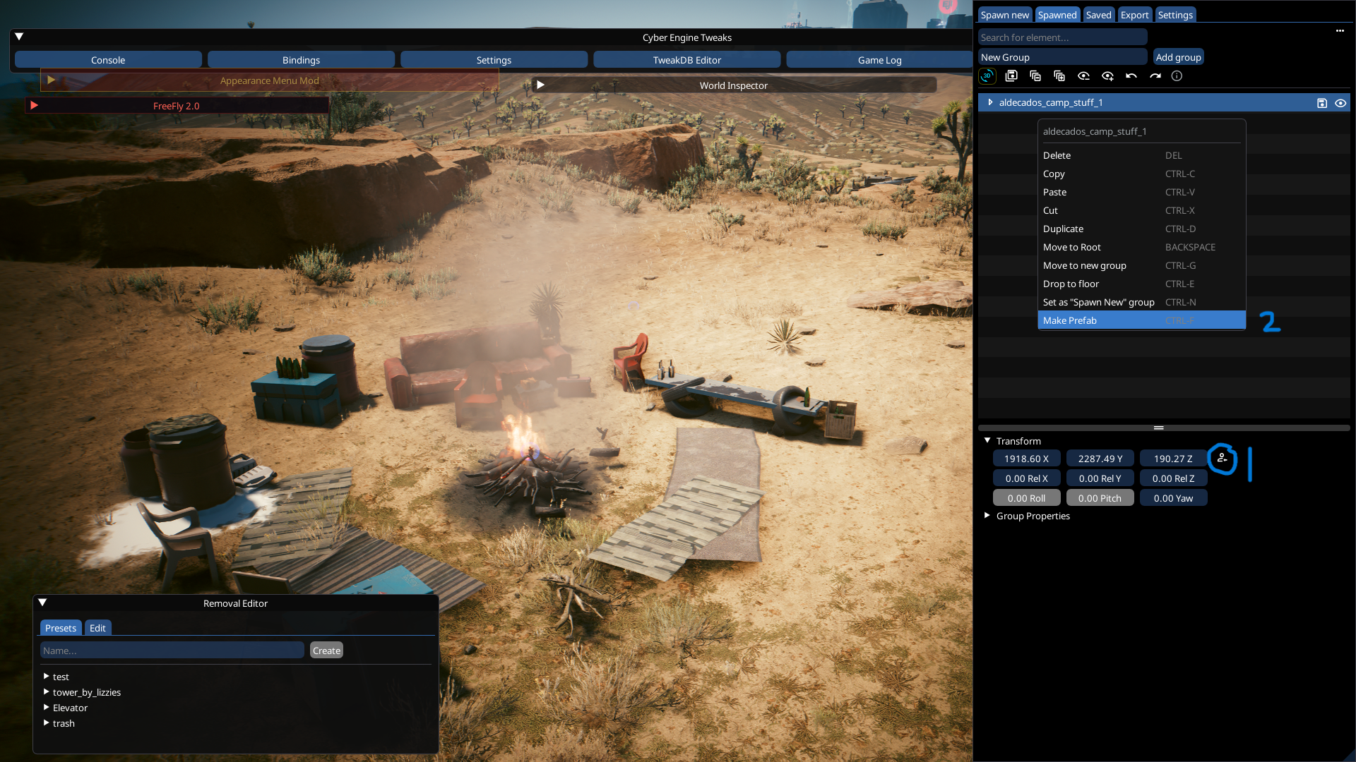 <figure><img src="https://1427525421-files.gitbook.io/~/files/v0/b/gitbook-x-prod.appspot.com/o/spaces%2F4gzcGtLrr90pVjAWVdTc%2Fuploads%2Fgit-blob-e4fb6b96d20b7e48f892b01a57bffb21fc9c3180%2Fworld_editing_prefab_group_1.png?alt=media" alt=""><figcaption><p>Bring the group to your location, and if its ok, convert to prefab</p></figcaption></figure>