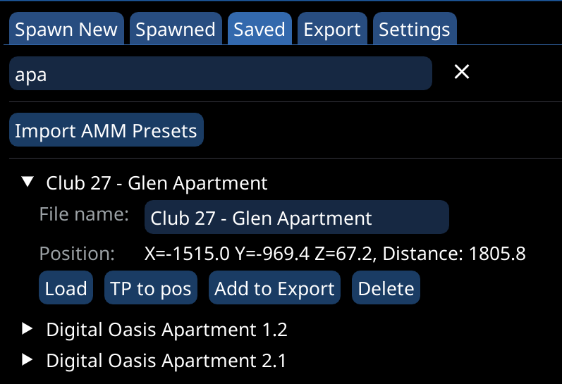 * Place the AMM decor preset `.json` inside `Cyberpunk 2077\bin\x64\plugins\cyber_engine_tweaks\mods\entSpawner\data\AMMImport`