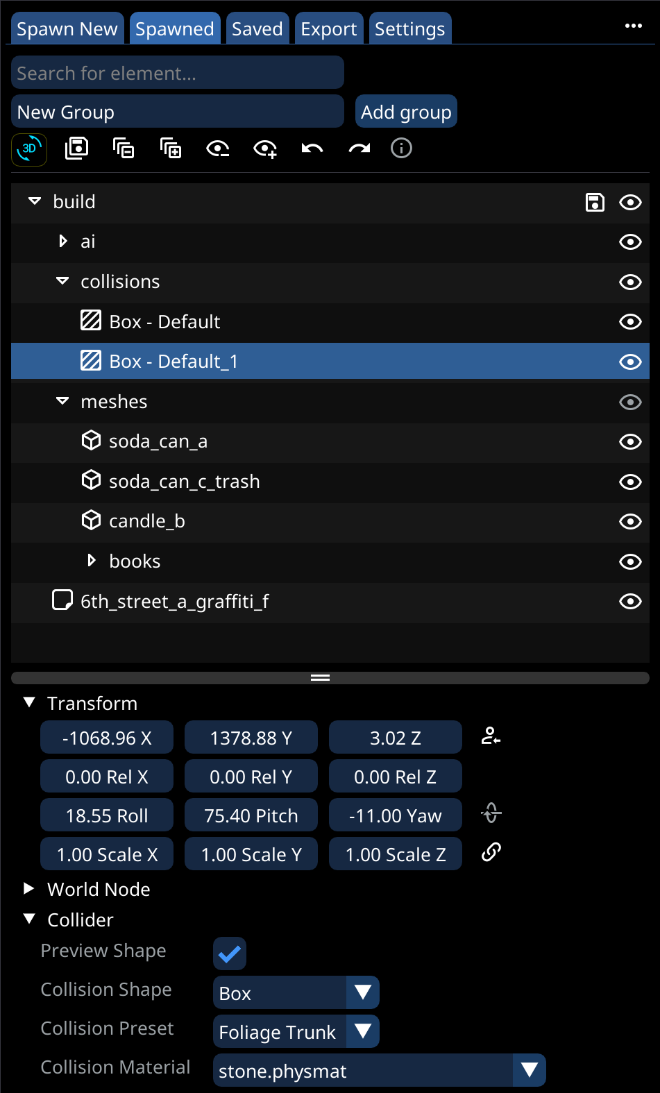 If you want to save a sub-group, to make it reusable, [make it a prefab](https://wiki.redmodding.org/cyberpunk-2077-modding/modding-guides/world-editing/object-spawner/tab-favorites-and-prefabs#creating-favorites-prefabs)