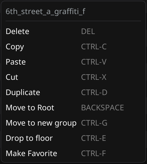 * `CTRL-F` : Make selected a [favorite / prefab](https://wiki.redmodding.org/cyberpunk-2077-modding/modding-guides/world-editing/object-spawner/ui-tabs-explained/tab-favorites-and-prefabs)