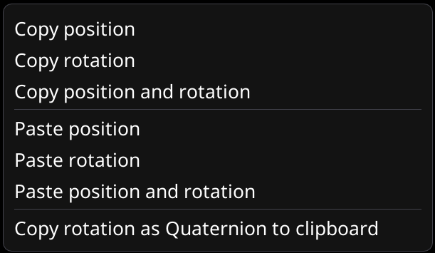 <figure><img src="https://1427525421-files.gitbook.io/~/files/v0/b/gitbook-x-prod.appspot.com/o/spaces%2F4gzcGtLrr90pVjAWVdTc%2Fuploads%2Fgit-blob-d1f06913b56bdbccc7bf90f88e76e63360917d52%2FOSCopyPasteTransforms?alt=media" alt="" width="306"><figcaption><p>Copy and paste transforms between objects</p></figcaption></figure>