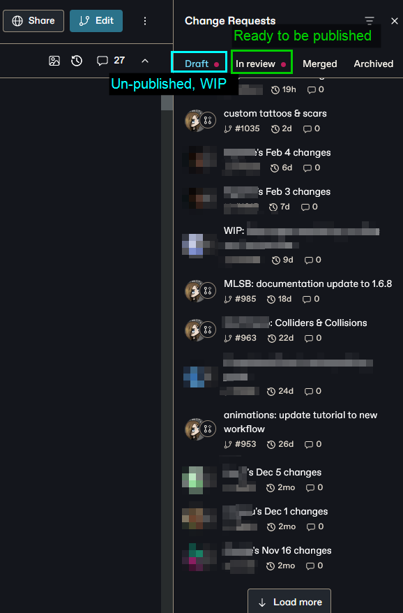<figure><img src="https://1427525421-files.gitbook.io/~/files/v0/b/gitbook-x-prod.appspot.com/o/spaces%2F4gzcGtLrr90pVjAWVdTc%2Fuploads%2Fgit-blob-725e452f874cbfb59c86188dbc43d84e0f92bdca%2Fwiki_editing_change_request_list.png?alt=media" alt=""><figcaption><p>Who created a change request doesn't matter much - everyone can edit them</p></figcaption></figure>